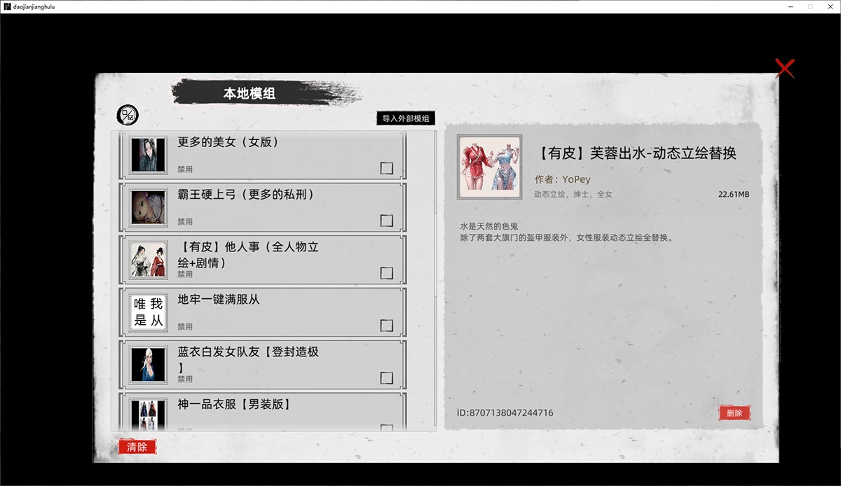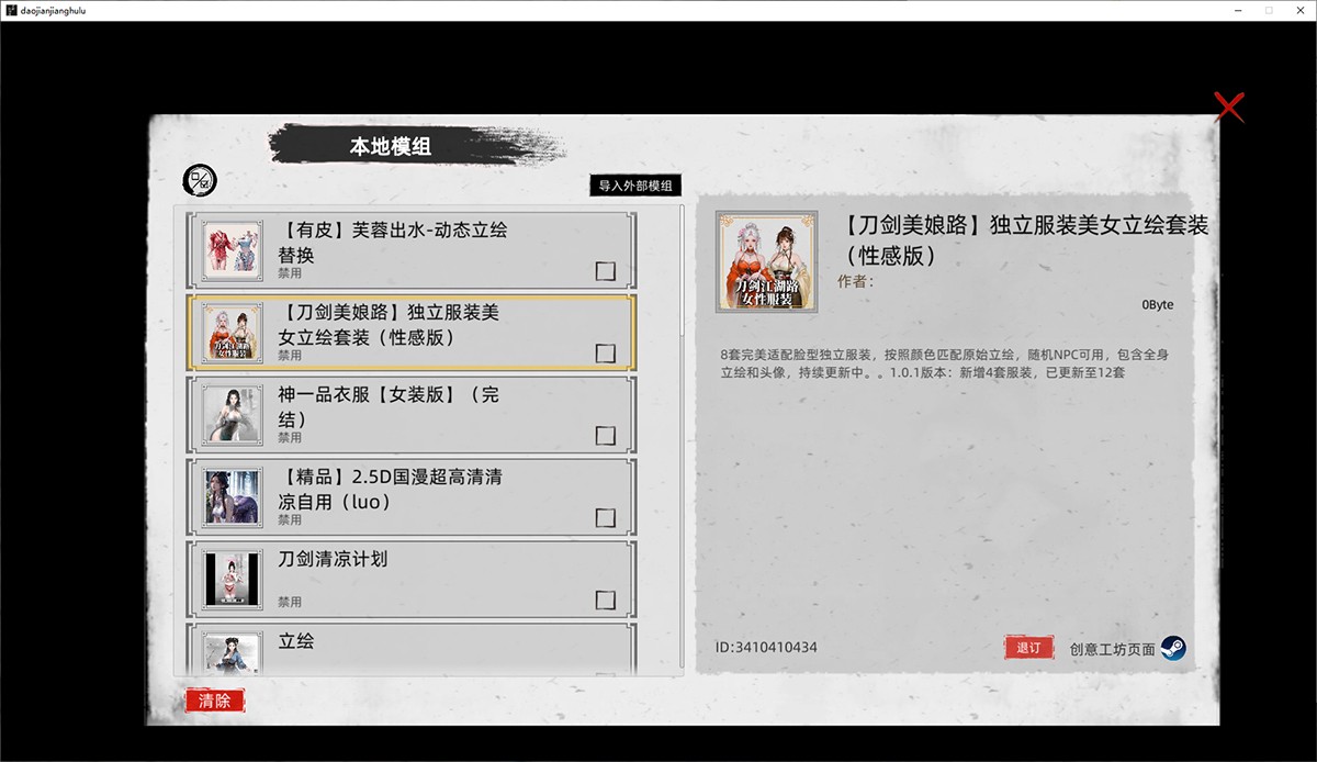 这是目前最先进的豪华魔改版,基于官方V1.03.0 DLC,直接预整合Steam创意工坊海量热门绅士MOD,总计超60项! 全角色美化立绘、动态服装优化、额外经典角色导入(如小龙女等武侠ICON),让江湖人物栩栩如生,春光乍现。 新增地牢系统、扩展互动玩法,一键开关MOD,无需繁琐安装,解压即玩。相比原版,这版视觉更精致、内容更丰富,完美诠释“人世似无穷”的无限可能——订阅工坊热门即体验倍增,现在魔改版直接打包,省时省力。