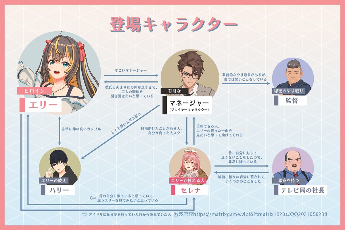 在这款模拟经营类游戏中,玩家化身为一名经纪人,负责培养新人偶像“艾莉”,帮助她从平凡少女成长为耀眼的超级明星。游戏围绕艾莉与她的男友“哈利”之间的情感纠葛展开,剧情跌宕起伏,充满张力。玩家将在追逐梦想与处理复杂情感的旅程中,体验一段扣人心弦的故事。获取方式:通过谷歌浏览器访问https://matrixgame.vip或添加QQ2021058238