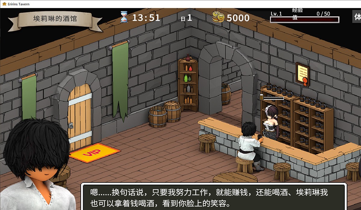 故事背景设定在一个幻想世界中,你扮演的主角帕斯卡尔(Pascal)曾是传说中的大法师,作为勇者队伍的一员拯救了世界。然而,一场神秘事件让他脱离伙伴,沉迷酒精,魔力也随之枯竭。日子过得浑浑噩噩,直到他偶然踏入街边一家名为“埃里林酒馆”的小店,一眼就爱上了温柔美丽的店主埃里林(Eririn)。从此,帕斯卡尔重燃斗志:通过接受赏金任务、与怪物战斗赚取金钱,不断光顾酒馆,争取成为VIP会员,赢得与埃里林独处的宝贵时光。但这条路并不容易——酒馆里挤满了竞争者,他们也对埃里林情有独钟。你必须巧妙应对这些“情敌”,用策略和实力脱颖而出。这份叙事简单却富有张力,像极了90年代的日式RPG:英雄落魄、重拾荣耀的经典桥段,却以酒馆为舞台,添加了轻松幽默的元素。