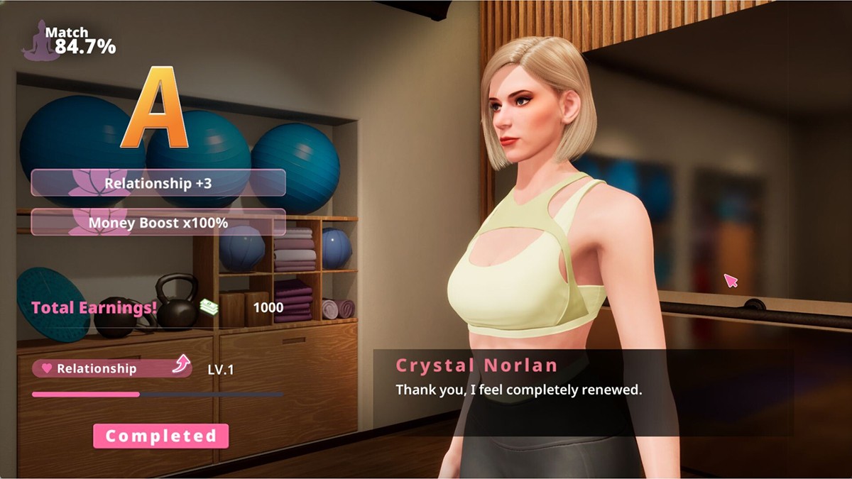 经营管理**:有效分配资源,扩建工作室、购买互动道具(如特殊瑜伽垫或精油),并与竞争对手展开较量。击败他们,让他们屈服或彻底出局,从而扩大你的影响力。