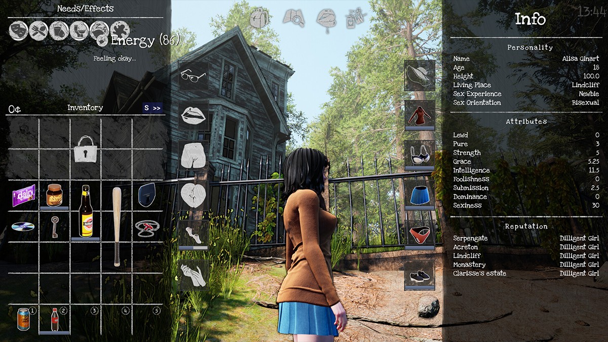 生存机制:Alisa需要处理饥饿、卫生等基本需求,同时应对意外情况。游戏灵感来源于经典RPG如《上古卷轴》和《辐射》mod,融入了独特的日常生活模拟,例如寻找衣物、联系外部援助等任务。